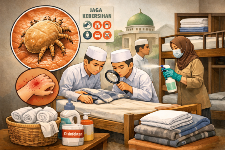 Pelajari pencegahan tungau Sarcoptes scabiei di pesantren melalui kebersihan lingkungan dan pengelolaan hunian komunal.